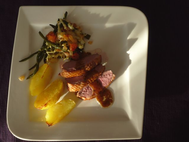 Die Entenbrust in Scheiben schneiden und mit den Kartoffeln und dem Bohnen-Tomaten-Auflauf anrichten.