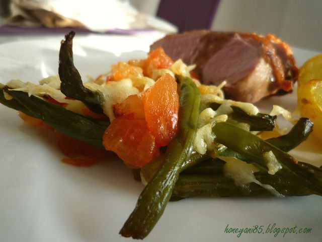 Tomaten in kleine Würfel schneiden. Eine Zwiebel in kleine Würfel schneiden. Die Hälfte der Zwiebeln kurz in einem Topf anschwitzen. Anschließend Tomaten und Bohnen dazu geben und salzen und pfeffern. Das Gemüse in eine Auflaufform geben und mit Käse bestreuen. Im vorgeheizten Ofen bei 175 Grad Umluft überbacken, bis der Käse leicht gebräunt ist. Die Ofenkartoffeln ebenfalls in den Ofen schieben.