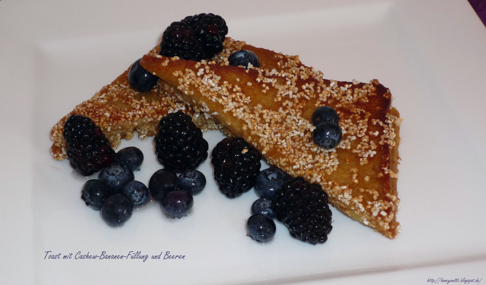 Da ich am Sonntag endlich mal mehr Zeit hatte, habe ich den Tag mit dem Berlin-Toast mit Cashew-Bananen-Füllung und Cruch-Kruste von Seite 76 begonnen. Dazu gab es Brombeeren und Heidelbeeren. Mhhh, das war wirklich, wirklich lecker. Und so reichhaltig.