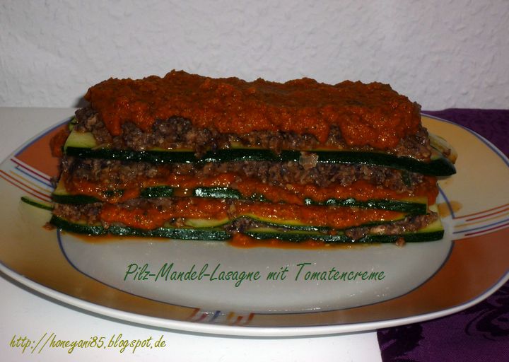 Abends habe ich mir die Pilz-Mandel-Lasagne mit Tomatencreme von Seite 123 gemacht. Dieses Gericht war ziemlich aufwendig. Ich hatte unmengen von dreckigen Töpfen und Pfannen und Schüsseln, als ich fertig war. Außerdem hat das Anrichten der Lasagne zu lange gedauert. Als ich dann endlich mit den 4 Lagen fertig war, war die Lasagne kalt. Die Zucchini-Lasagneblätter blieben ja eh kalt und die eigentlich warme Füllung und Sauce ist zwischen den Zucchinis schnell abgekühlt. Also habe ich spontan direkt mit dem Abwasch begonnen und die Lasagne für 15 Minuten in den Ofen gestellt. So konnte ich die Lasagne dann doch noch warm genießen. Und auch dieses Gericht war wieder sehr lecker.