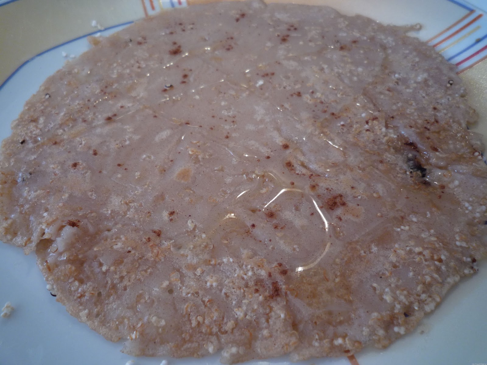 Ich hatte noch etwas Teig übrig, in den ich die Toasts gewendet hatte. Den habe ich dann zum Schluß mit den ebenfalls übrig gebliebenen Amaranth in die Pfanne gegeben. Raus kam ein ultra leckerer Pfannkuchen. Den habe ich noch ein bisschen mit Agavensirup beträufelt und mit Zimt bestreut. Wow. Das Rezept merke ich mir auf jeden Fall, das sind die schnellsten und einfachsten Pfannkuchen, die ich bisher gemacht hab. Einfach Pflanzenmilch, Vollkornmehl, Agavendicksaft, 1 Prise Salz und Zimt zu einem dünnflüssigen Teig zusammenmischen.