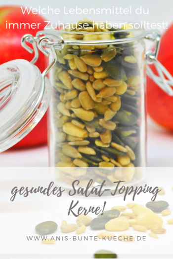 Ungesalzene Nüsse und Kerne habe ich in verschiedenen Varianten Zuhause. Fürs Frühstück eignen sich z.B. gehackte oder gehobelte Mandeln. Cashewkerne mag ich angeröstet gerne als Topping über Salaten oder Gemüsepfannen. Walnüsse eignen sich super zum Naschen. Ich finde, auch hier macht es die Vielfalt, also habe ruhig verschiedene Nüsse Zuhause.