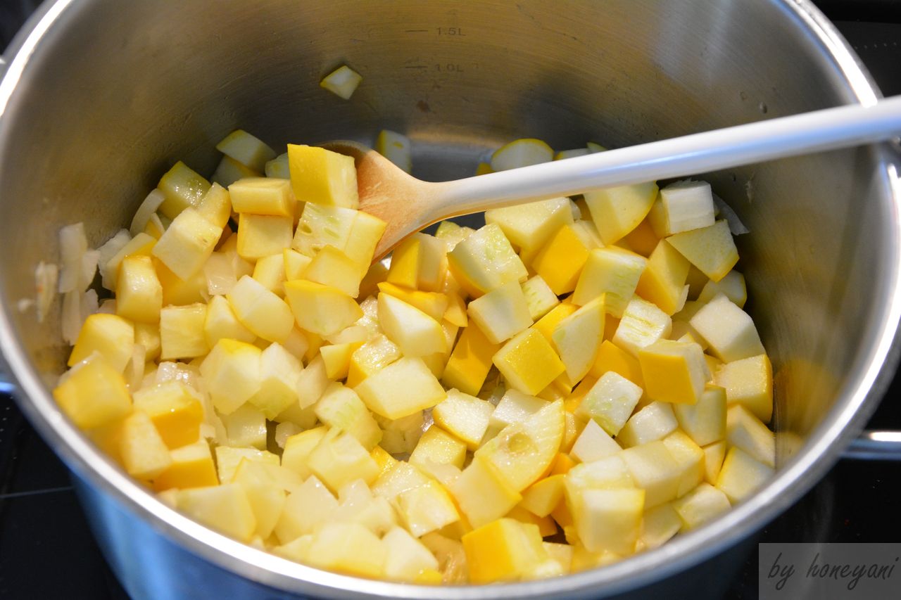 Die Zucchini ebenfalls in Würfel schneiden und in einem Topf mit Öl andünsten. Die Kartoffeln dazu geben und ebenfalls kurz mit dünsten. Dann die rote Beete und das Dämpfwasser dazu geben und erhitzen.