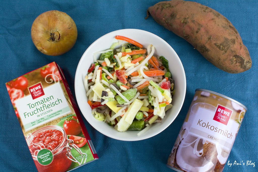 Die Schnippelei kannst du dir sparen, denn das Gemüse kommt schon fertig geschnitten aus der Tiefkühltruhe. Es soll ja schließlich schnell gehen. Gerade zum Feierabend, wenn du noch Lust auf ein warmes Essen hast, dann kann Gemüse schneiden ganz schön aufhalten. Ich habe mich für Wok-Gemüse entschieden. Das passt prima zu dem Curry. Du kannst aber je nach deinem Geschmack auch eine ander Mischung nehmen, z.B. mit Brokkoli und Blumenkohl. Das kann ich mir auch sehr gut vorstellen.