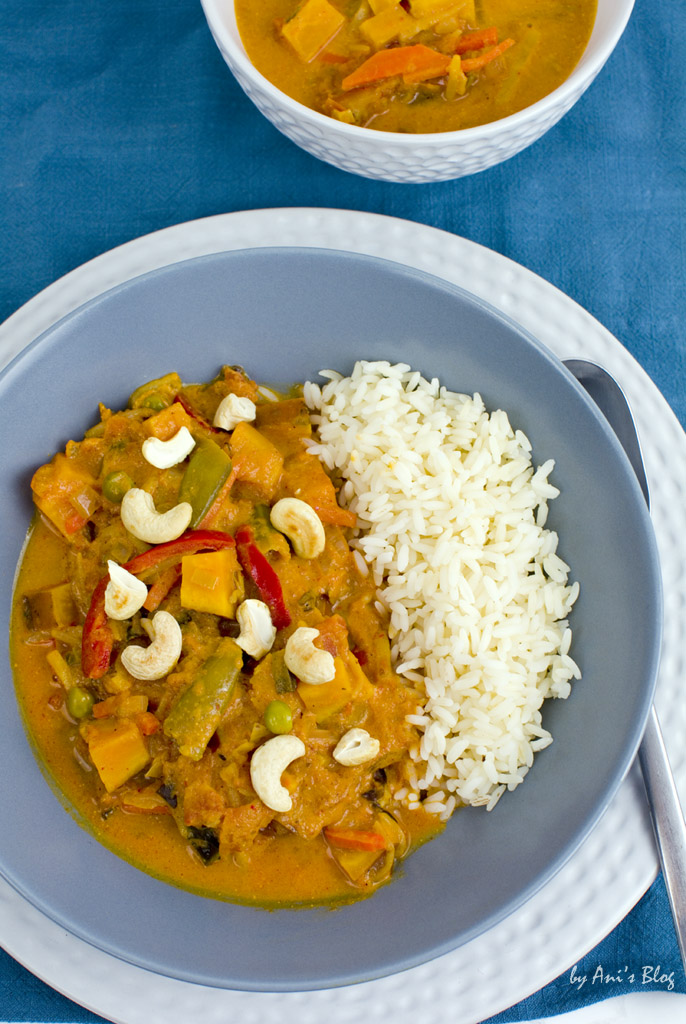 Für mich bietet so ein Blogevent immer die Möglichkeit, mal wieder meine eingetretenen Pfade zu verlassen und Rezepte zu probieren, die ich schon läger nicht mehr gekocht habe. Im Februar heißt das Thema Curryliebe. Ich finde Currys total praktisch. Je nachdem, wieviele Zutaten man verwendet, gehen sie ziemlich schnell, einfach alle Zutaten in einen Topf, ein paar Gewürze oder Currypaste dazu und kurz kochen lassen. Currys haben also das Potenzial für ein schnelles und einfaches Rezept.