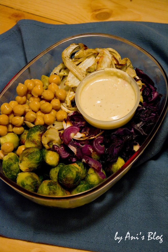Bei so kaltem Wetter im Winter schmeckt mir Ofengemüse total gut. Viel gutes Gemüse geröstet im Ofen, dabei bekommt das Gemüse so einen leckeren Geschmack. Außerdem braucht man nur das Gemüse klein schneiden und hat dann erstmal nichts mehr zu tun und muss nur noch warten, bis das Gemüse fertig aus dem Ofen kommt. Doch am besten nutzt ihr die Zeit und die anderen Zutaten für die Buddha Bowl zuzubereiten und nicht um – Achtung TIPP – während dessen schonmal YOGA zu machen. Das kann böse in die Hose gehen und am Ende habt ganz viel Gemüsekohle. Woher ich das weiß, das verrate ich jetzt lieber nicht. ?