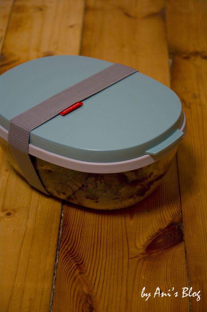 Die Lunchbox Ellipse von Rosti Mepal habe ich erst vor kurzem entdeckt. Ich finde sie toll. Neben der großen Schüssel hat sie noch eine Zwischenschicht, die die Schüssel dicht verschließt und zusätzlich Stauraum bietet für Sachen, die nicht mit unten rein sollen und einen kleinen Behälter für das Dressing.