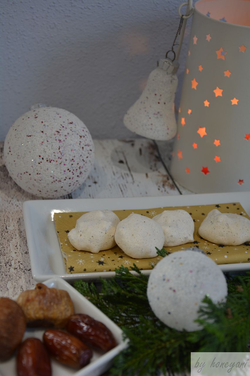 Makronen sind himmlisch luftige Weihnachtsplätzchen aus steif geschlagenem Eiweiß. In diesen Makronen verstecken sich getrocknete Feigen und Datteln und so werden die Makronen super fruchtig und haben etwas ganz Besonderes. Dazu sind die Plätzchen glutenfrei, weil sie ohne Mehl gebacken werden. Zuerst müsst ihr die Trockenfrüchte in feine Stücke schneiden. Als nächstes das Eiweiß mit einer Prise Salz steif schlagen. Wenn der Eischnee fest ist, den Zucker und die Gewürze nach und nach mit einrieseln lassen und kurz unterschlagen. Anschließend alle weiteren Zutaten mit dem Eischnee vermischen. Die Makronenmasse könnt ihr nun mit zwei Teelöffeln in Häufchen auf ein mit Backpapier belegtes Blech setzen. Die Baiserhäufchen werden im vorgeheizten Ofen (E-Herd: 120°C, Umluft: 100°C) für 60 Minuten gebacken. Passt auf, die Zeit variiert je nach eurem Ofen. Bei mir waren sämtliche Plätzchen schon nach der dreiviertel Zeit fertig.fruchtige Makronen - Weihnachtsplätzchen