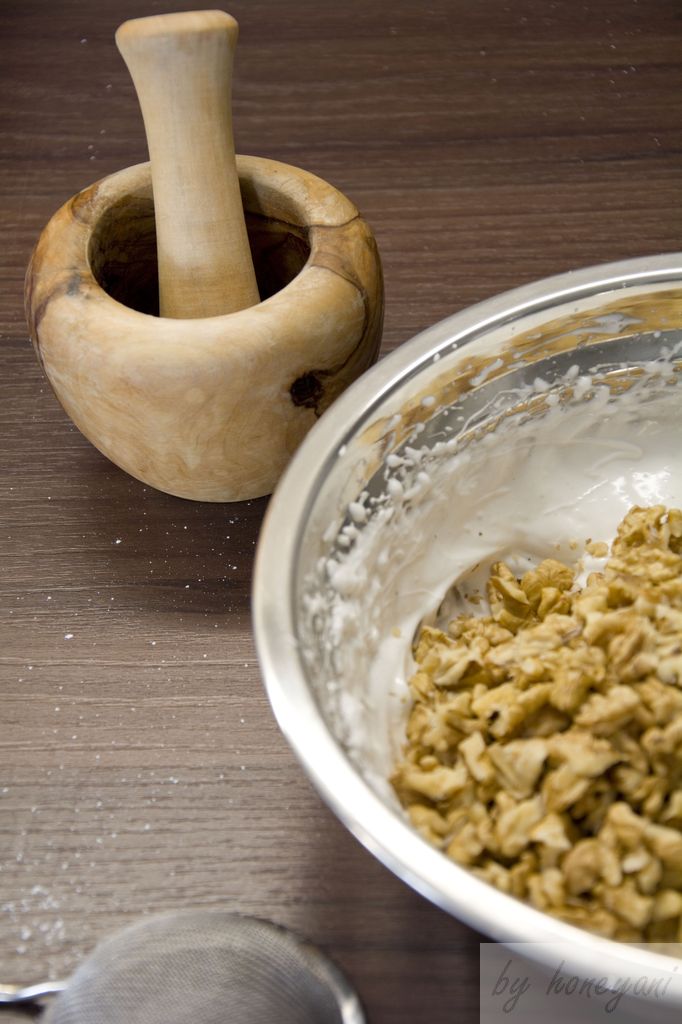 Zuerst die Eier trennen. Die Nelke mit einem Mörser zerstoßen. Die Walnusshälften vierteln. Den Puderzucker durchsieben.
